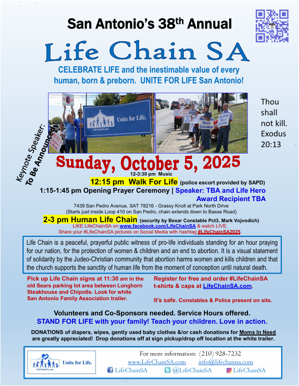 Go to your usual spot on the San Pedro Sidewalk, LIKE & tune in to www.facebook.com/LifeChainSA for a Facebook LIVE EVENT to include prominent speakers and Life Hero Award Presentation.